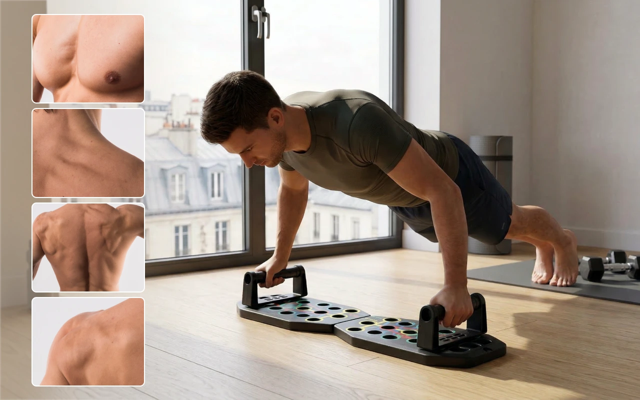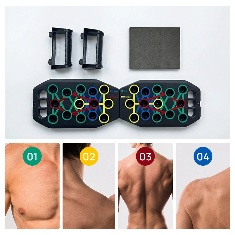 Coloured positions guide hands to hit specific muscle areas. Enjoy balanced strength in chest, arms, shoulders and back.