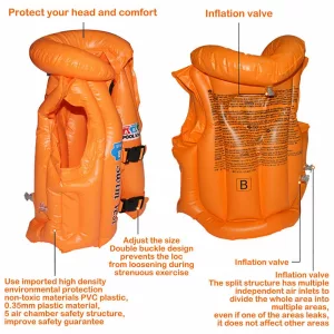 THREO life jackets for kids come complete with an integrated neck pillow. This has been designed to protect your child’s head while they are in the water. The buoyancy aid jacket is made from 0.35mm PVC plastic with 5 air chamber safety structures which will provide high-density environmental protection. It fits children of 4 to 14 years old. When choosing the size, keep in mind that this personal flotation device should fit your kid snugly. This way you will ensure his ultimate safety no matter how deep into the water he goes.
