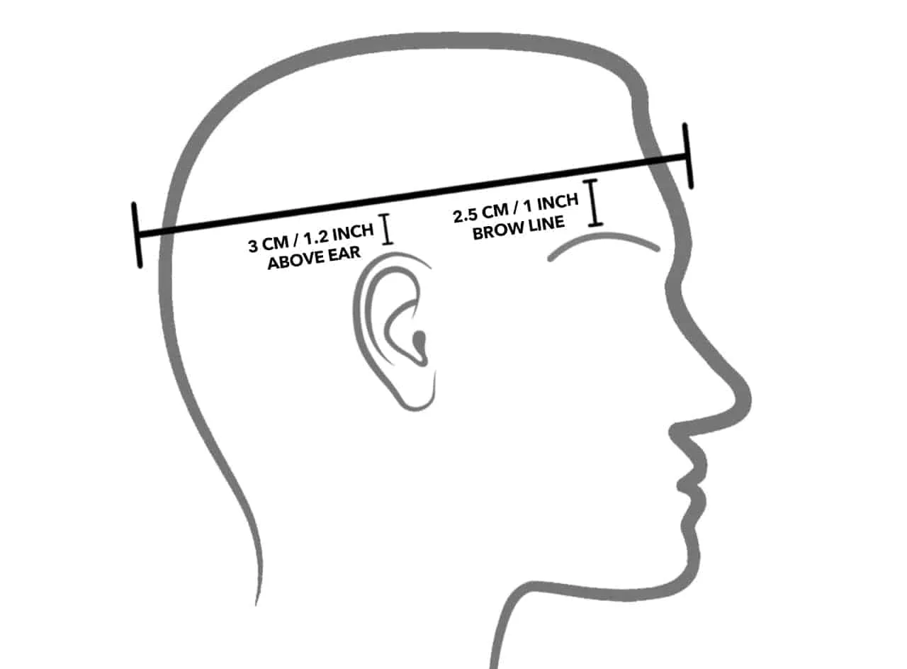 - 2. Place it at the back of the head at the widest point, guide it over the ears and hold it together about 2cm (1inch) above your eyebrows.