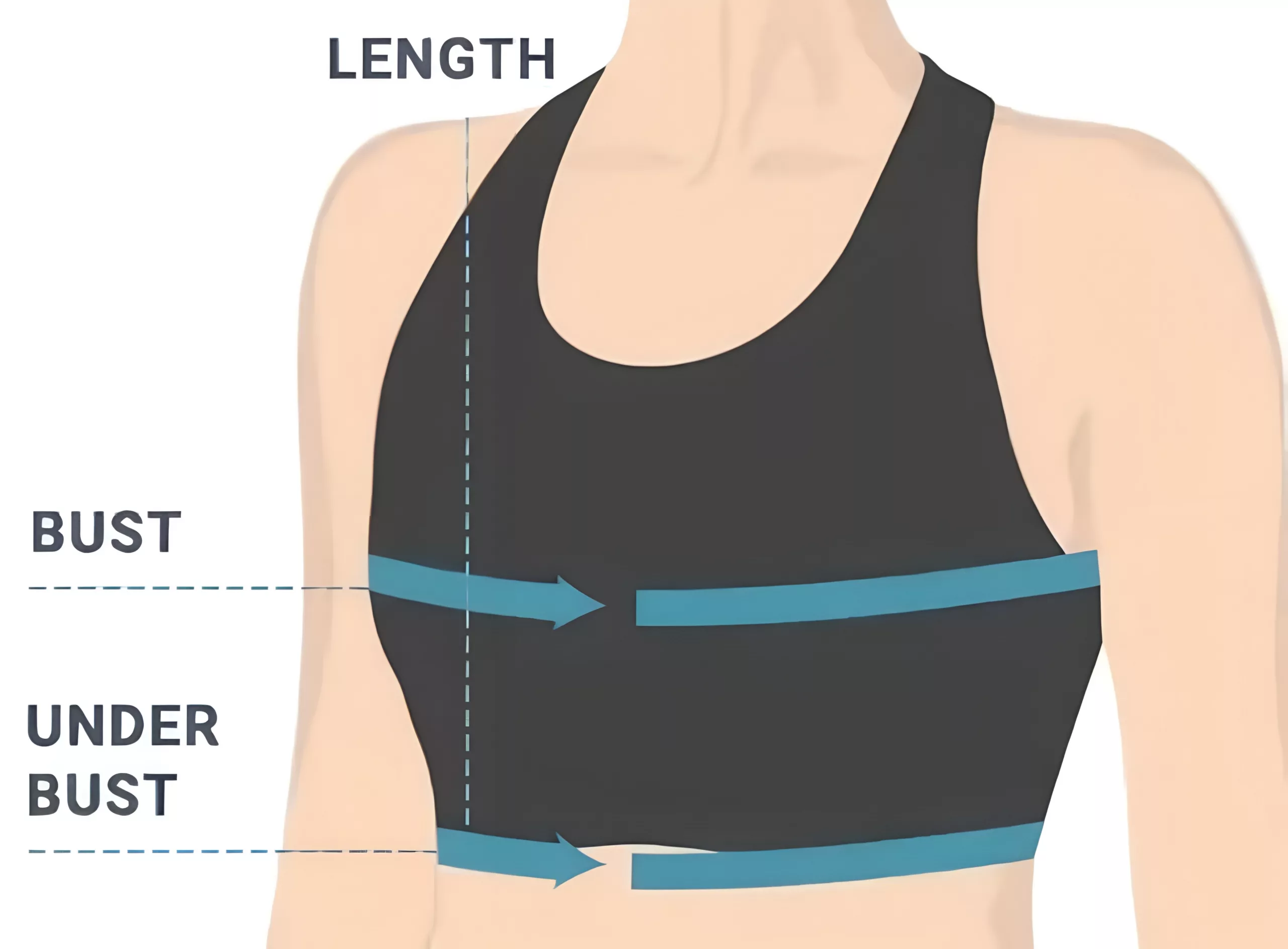 • 4. Start the measuring tape at your shoulder and extend it down to the underbust line.