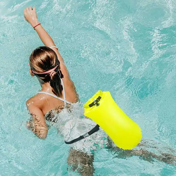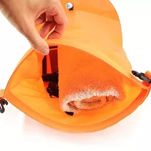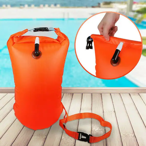 Our swimming buoy is made of durable PVC fabric, which is soft, comfortable, and won’t leak. The strong fabric ensures secure waterproof protection for your belongings. What’s more, this buoy is very easy to use. It has an easy-inflating air nozzle, which can be quickly and easily deflated when needed. Just place your belongings inside the dry bag, roll down the top, clip to close, and inflate to make it float. The buoy’s belt is highly adjustable to fit around your waist.